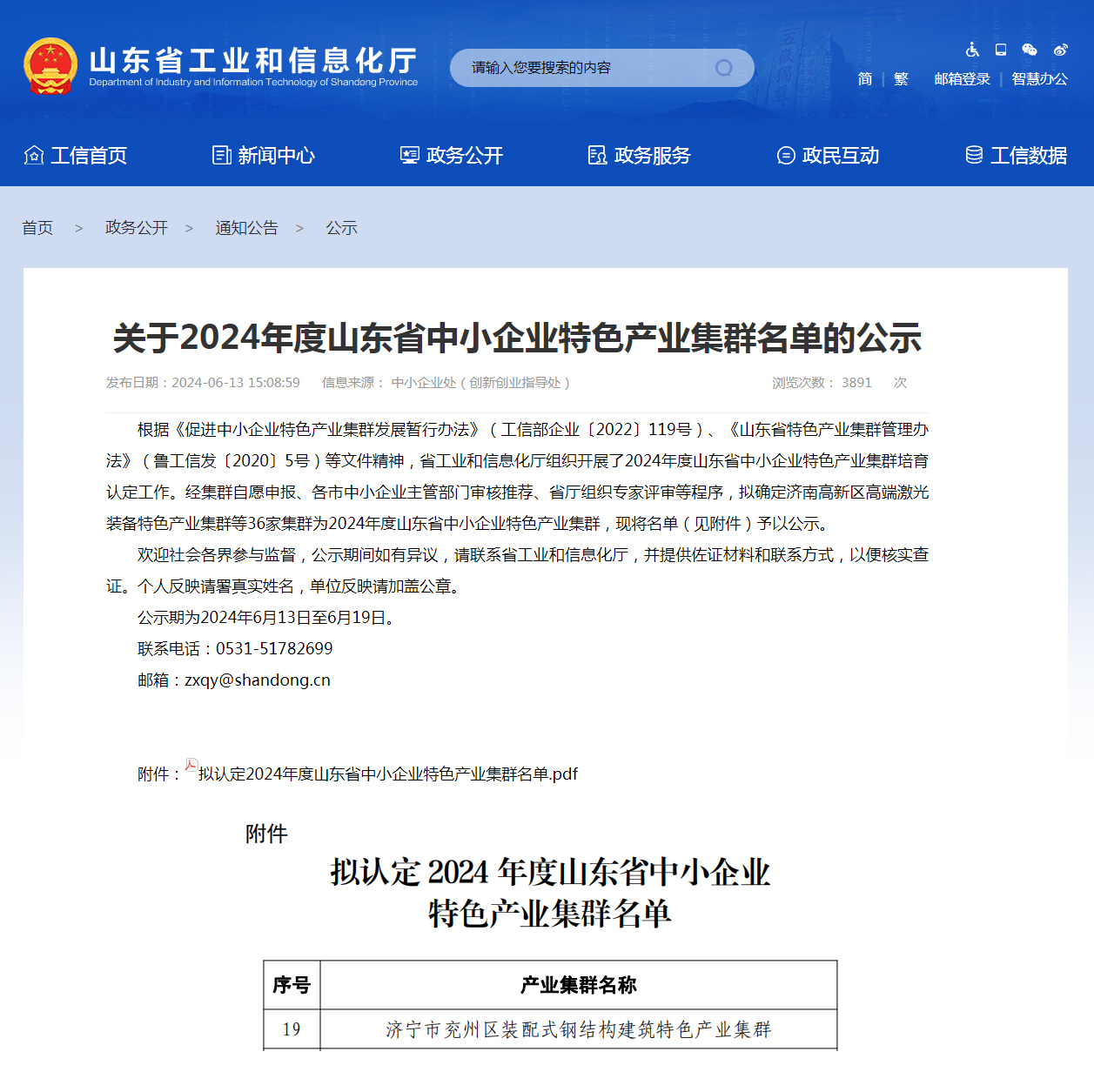 近日,山東省工業和信息化廳公布了2024年度山東省特色產業集群公示名單,全省共36家集群入圍。以經典重工集團股份有限公司為主體的濟寧市兗州區裝配式鋼結構建筑特色產業集群成功入選。