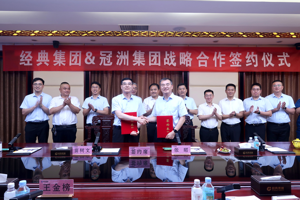 6月13日上午,經典重工集團股份有限公司與山東冠洲股份有限公司簽訂戰略合作協議。經典集團董事會主席苗樹文、冠洲董事長張昭代表雙方簽訂戰略合作協議并講話。經典集團副總經理鄭建康、王金榜、張爭,冠洲宋總出席簽約儀式。