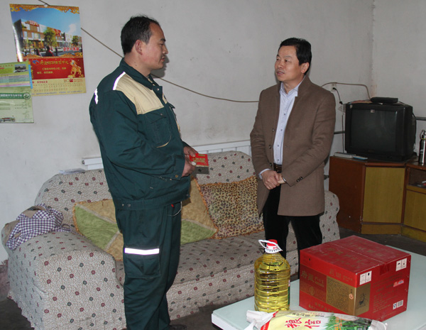 每到一戶,集團(tuán)領(lǐng)導(dǎo)與職工家屬親切握手,面對(duì)面促膝交談,了解職工的家庭收入、子女入學(xué)、生活實(shí)際困難情況。送去大米、面粉、食用油等生活物資及600元公司慰問(wèn)金,集團(tuán)領(lǐng)導(dǎo)鼓勵(lì)職工振奮精神,充滿信心,相信集體,克服眼前困難。