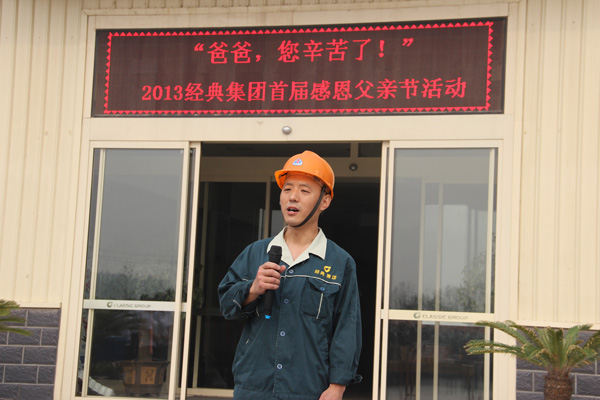 2013年6月16日上午7點(diǎn)30分,經(jīng)典集團(tuán)開(kāi)展2013年度父親節(jié)“送溫暖,獻(xiàn)愛(ài)心”活動(dòng),為集團(tuán)全體員工的父親送上愛(ài)心手機(jī),千元節(jié)日紅包,集團(tuán)董事長(zhǎng)苗樹文,總經(jīng)理杜福生及高層領(lǐng)導(dǎo)先后致辭并發(fā)放獎(jiǎng)金及手機(jī)。活動(dòng)舉行完后,經(jīng)典集團(tuán)總經(jīng)理杜福生親自到部分員工家中為員工父親送上集團(tuán)的問(wèn)候與節(jié)日祝福。