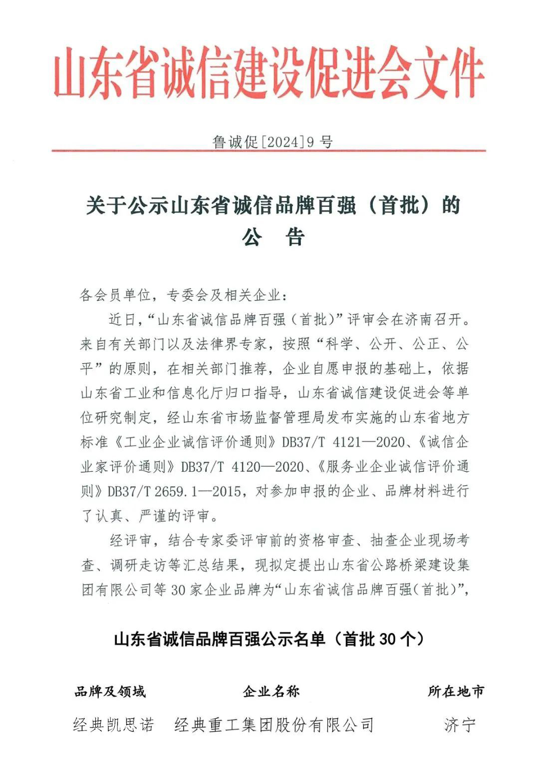 端信之風|經典集團入選山東省誠信品牌百強(首批)名單
